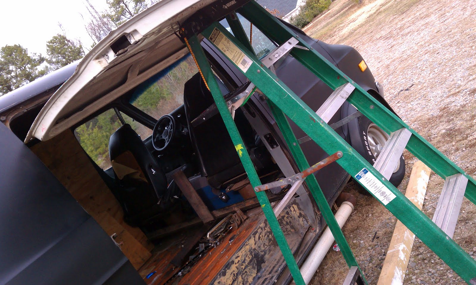 Once the hinges were on I put the door in place...... I put it on the ladder so that it was easier to maneuver....... while Matt helped me put it in place I just put a couple self-tapping screws in the hinge to hold it on so that I could make sure that everything fit before I welded anything.....